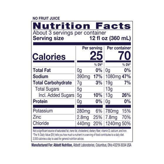 Water Dextrose Less than 2% of: Citric Acid, Potassium Citrate, Salt, Artificial Flavor, Sodium Citrate, Sucralose, Acesulfame Potassium, Zinc Gluconate, Red 40 and Blue 1