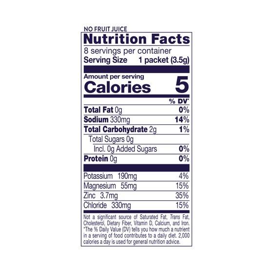 Citric Acid, Salt, Potassium Citrate, Magnesium Citrate, Sodium Citrate, Natural Flavors, Corn Maltodextrin *, Less than 2% of: Acesulfame Potassium, Zinc Gluconate, Sucralose, Calcium Silicate
