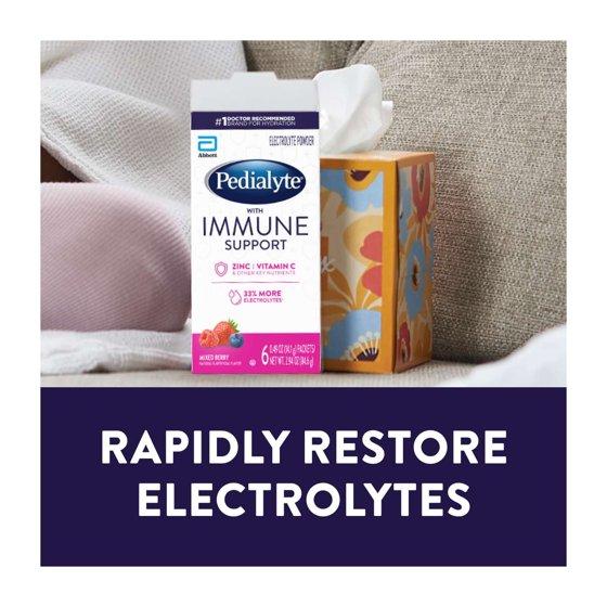 Pedialyte with Immune Support has 4 key nutrients to support your immune system: zinc to help build new immune cells, vitamin C to promote cell health, vitamin B12 to activate immune cells, and vitamin E to support cell membranes. It also has 3x the electrolytes and 50% less sugar vs the leading sports drink.* Hydrate on the go with convenient electrolyte drink powder packets from Pedialyte, the #1 doctorrecommended brand for hydration. * Pedialyte with Immune Support has 1380mg sodium and no more than 19g sugars per liter; leading sports drink has ~460mg sodium and ~58g sugars per liter.