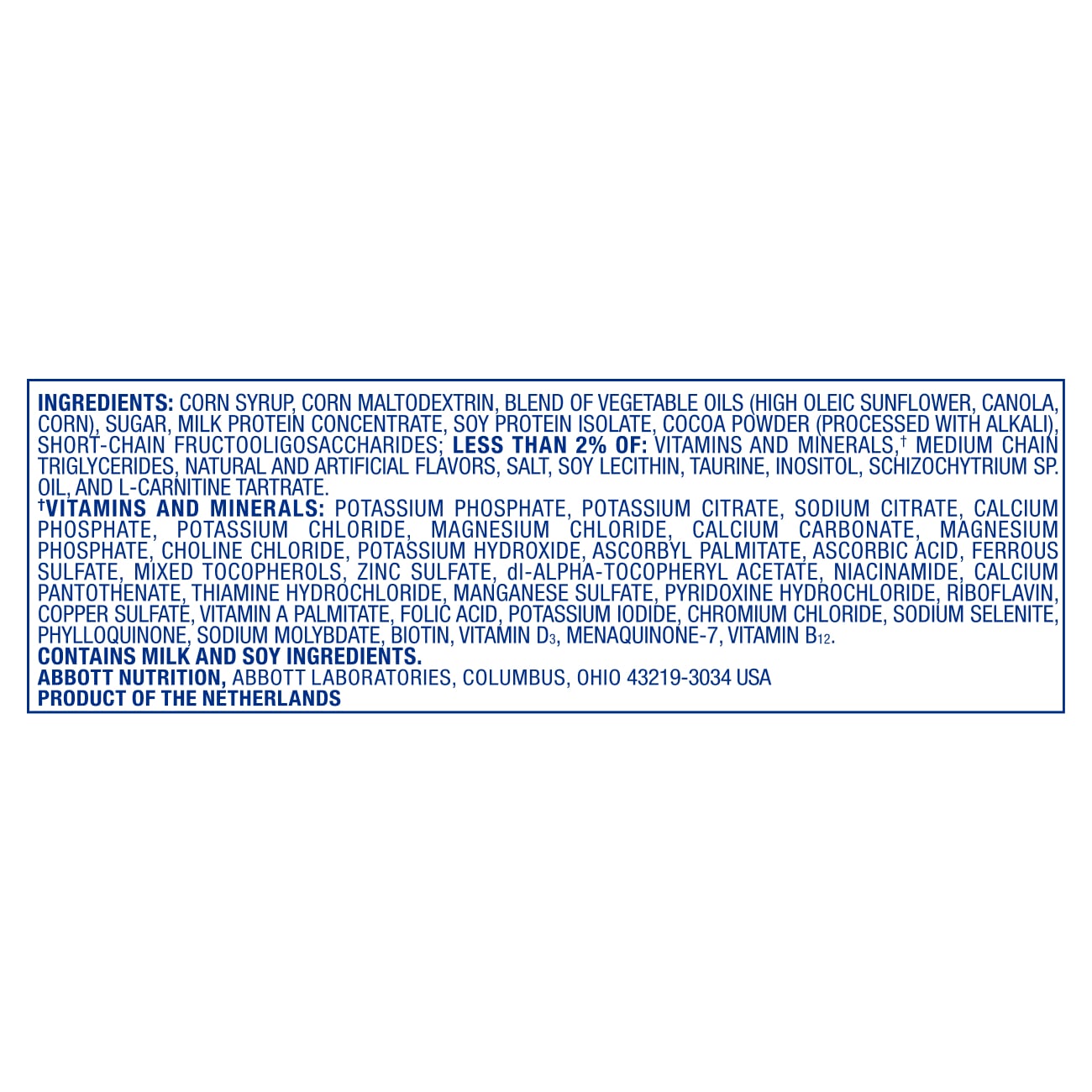 Water, Corn Maltodextrin, Blend of Vegetable Oils (Soy, High Oleic Safflower), Sugar, Milk Protein Concentrate, Cocoa Powder (Processed with Alkali), Soy Protein Isolate, Nonfat Milk. Less than 0.5% of: Vitamins & Minerals (Calcium Phosphate, Potassium Citrate, Potassium Phosphate, Potassium Chloride, Calcium Carbonate, Magnesium Phosphate, Ascorbic Acid, Choline Chloride, Potassium Hydroxide, Ferrous Sulfate, dl-Alpha-Tocopheryl Acetate, Zinc Sulfate, Niacinamide, Calcium Pantothenate, Manganese Sulfate, Thiamine Hydrochloride, Pyridoxine Hydrochloride, Riboflavin, Vitamin A Palmitate, Copper Sulfate, Folic Acid, Chromium Chloride, Potassium Iodide, Sodium Molybdate, Sodium Selenate, Biotin, Phylloquinone, Vitamin D3, Vitamin B12, Menaquinone-7), Cellulose Gel, Natural & Artificial Flavors, Tuna Oil, Salt, Monoglycerides, Soy Lecithin, Cellulose Gum, Carrageenan, Inositol, Taurine, Stevia Leaf Extract, L-Carnitine, and Lutein. Contains milk and soy ingredients.
