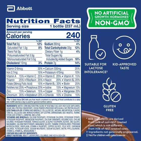 Water, Corn Maltodextrin, Blend of Vegetable Oils (Soy, High Oleic Safflower), Sugar, Milk Protein Concentrate, Cocoa Powder (Processed with Alkali), Soy Protein Isolate; Less than 0.5% of: Vitamins and Minerals (a), Cellulose Gel, Natural and Artificial Flavors, Tuna Oil, Cellulose Gum, Monoglycerides, Soy Lecithin, Carrageenan, Salt, Inositol, Taurine, Stevia Leaf Extract, L-Carnitine, and Lutein, (a) Vitamins and Minerals: Calcium Phosphate, Potassium Chloride, Potassium Citrate, Potassium Phosphate, Magnesium Phosphate, Calcium Carbonate, Ascorbic Acid, Choline Chloride, Potassium Hydroxide, Ferrous Sulfate, DL-Alpha-Tocopherol Acetate, Zinc Sulfate, Niacinamide, Calcium Pantothenate, Manganese Sulfate, Thiamine Hydrochloride, Pyridoxine Hydrochloride, Riboflavin, Vitamin A Palmitate, Copper Sulfate, Folic Acid, Chromium Chloride, Potassium Iodide, Sodium Molybdate, Sodium Selenate, Biotin, Phylloquinone, Vitamin D3, Vitamin B12, Menaquinoine-7.