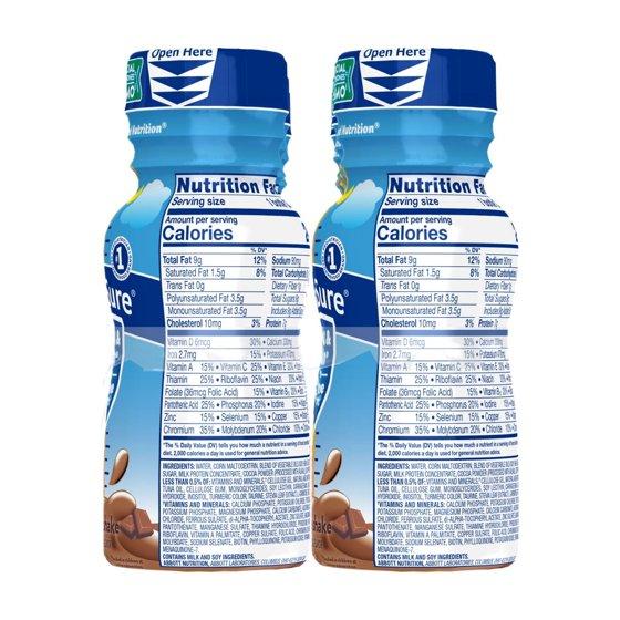 Water, Corn Maltodextrin, Blend of Vegetable Oils (Soy, High Oleic Safflower), Sugar, Milk Protein Concentrate, Cocoa Powder (Processed with Alkali), Soy Protein Isolate; Less than 0.5% of: Vitamins and Minerals (a), Cellulose Gel, Natural and Artificial Flavors, Tuna Oil, Cellulose Gum, Monoglycerides, Soy Lecithin, Carrageenan, Salt, Inositol, Taurine, Stevia Leaf Extract, L-Carnitine, and Lutein, (a) Vitamins and Minerals: Calcium Phosphate, Potassium Chloride, Potassium Citrate, Potassium Phosphate, Magnesium Phosphate, Calcium Carbonate, Ascorbic Acid, Choline Chloride, Potassium Hydroxide, Ferrous Sulfate, DL-Alpha-Tocopherol Acetate, Zinc Sulfate, Niacinamide, Calcium Pantothenate, Manganese Sulfate, Thiamine Hydrochloride, Pyridoxine Hydrochloride, Riboflavin, Vitamin A Palmitate, Copper Sulfate, Folic Acid, Chromium Chloride, Potassium Iodide, Sodium Molybdate, Sodium Selenate, Biotin, Phylloquinone, Vitamin D3, Vitamin B12, Menaquinoine-7.
