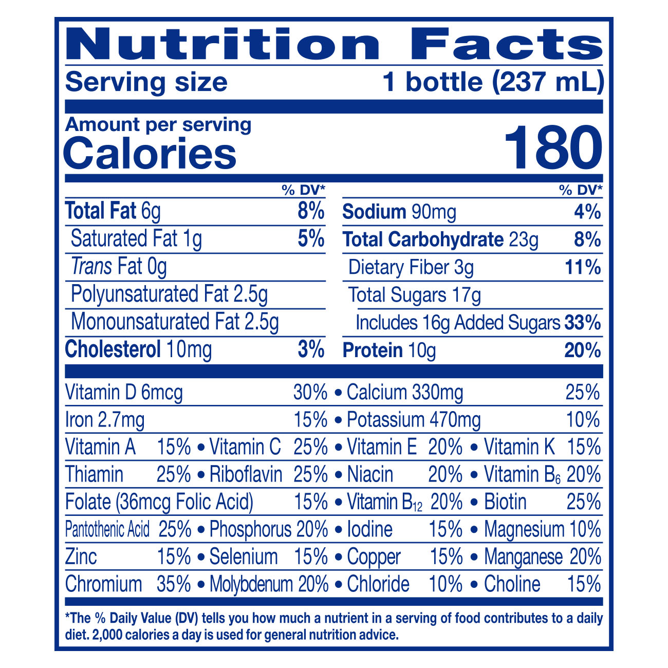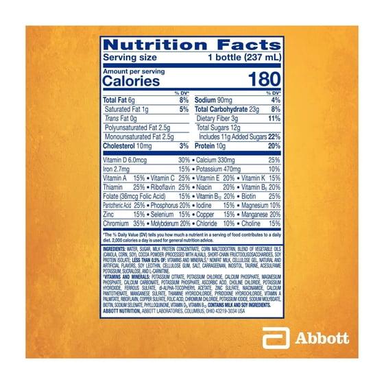 Water, Sugar, Milk Protein Concentrate, Blend of Vegetable Oils (Canola, Corn, Soy), Corn Maltodextrin, Short-chain Fructooligosaccharides, Cocoa Powder (Processed with Alkali), Soy Protein Isolate, Less than 0.5% of: Vitamins & Minerals (Potassium Citrate, Potassium Chloride, Calcium Phosphate, Magnesium Phosphate, Potassium Phosphate, Ascorbic Acid, Choline Chloride, Calcium Carbonate, Ferrous Sulfate, dl-Alpha-Tocopheryl Acetate, Zinc Sulfate, Niacinamide, Calcium Pantothenate, Manganese Sulfate, Thiamine Hydrochloride, Pyridoxine Hydrochloride, Vitamin A Palmitate, Riboflavin, Copper Sulfate, Folic Acid, Chromium Chloride, Potassium Iodide, Sodium Molybdate, Biotin, Sodium Selenate, Phylloquinone, Vitamin D3, Vitamin B12), Nonfat Milk, Cellulose Gel, Natural & Artificial Flavor, Salt, Cellulose Gum, Monoglycerides, Soy Lecithin, Potassium Hydroxide, Sucralose, Carrageenan, Acesulfame Potassium, Inositol, Taurine, L-Carnitine, Red 3
