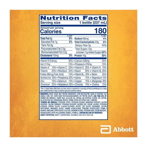Water, Sugar, Milk Protein Concentrate, Corn Maltodextrin, Blend of Vegetable Oils (Canola, Corn, Soy), Short-Chain Fructooligosaccharides, Soy Protein Isolate; Less than 0.5% of: Vitamins and Minerals(a), Nonfat Milk, Cellulose Gel, Natural and Artificial Flavors, Soy Lecithin, Cellulose Gum, Salt, Carrageenan, Inositol, Taurine, Stevia Leaf Extract, and L-Carnitine, (a) Vitamins and Minerals: Potassium Citrate, Potassium Chloride, Magnesium Phosphate, Calcium Phosphate, Calcium Carbonate, Potassium Phosphate, Ascorbic Acid, Choline Chloride, Potassium Hydroxide, Ferrous Sulfate, DL-Alpha-Tocopheryl Acetate, Zinc Sulfate, Niacinamide, Calcium Pantothenate, Manganese Sulfate, Thiamine Hydrochloride, Pyridoxine Hydrochloride, Vitamin A Palmitate, Riboflavin, Copper Sulfate, Folic Acid, Chromium Chloride, Potassium Iodide, Sodium Molyboate Sodium Selenate, Biotin, Phylloquinone, Vitamin D3, Vitamin B12.