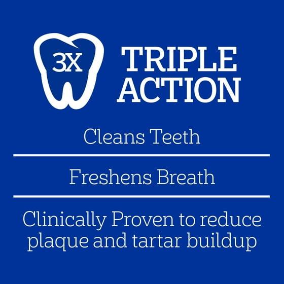 - Comes with triple action which reduces tartar buildup, cleans teeth, and freshens breath.