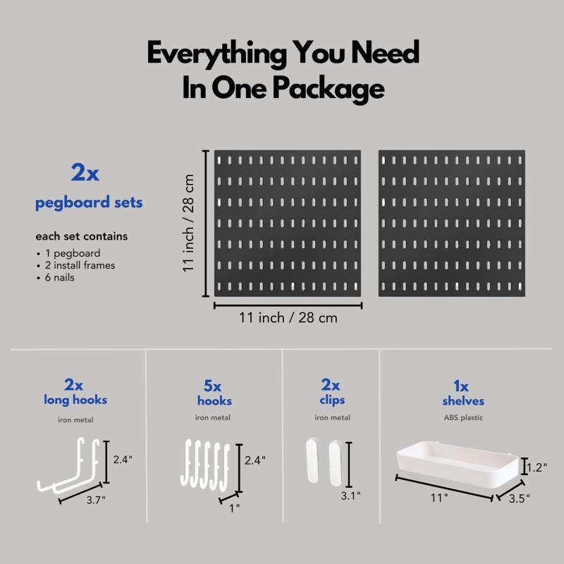- With our pegboard panel kit you will get two pegboard panels each with 11" x 11", two shelves 11" x 3.5" x 1.2", two clips 3.1", five hooks 1" x 2.4", two long hooks.