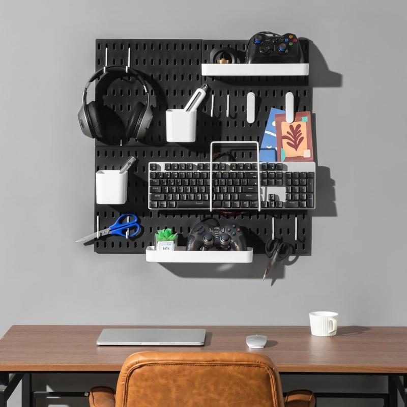 - Easily organize your games and other office areas with our versatile and efficient wall mounted storage pegboard kit. Maximize wall space by neatly hanging your tools, accessories, and gear for quick access, keeping things tidy and enhancing the ambiance of your space.