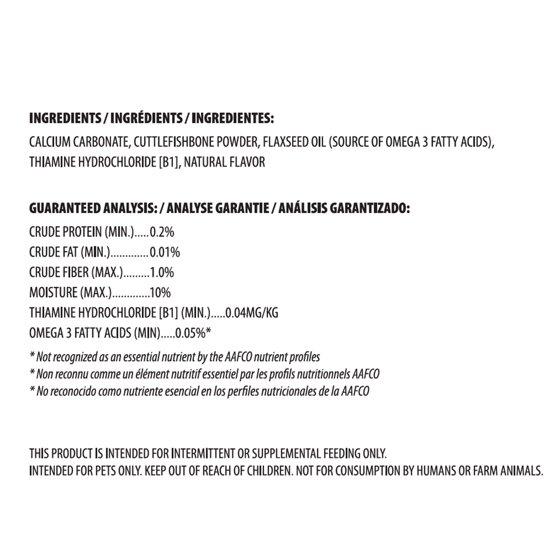 - INGREDIENTS: Calcium Carbonate, Cuttlefish Bone Powder, Flaxseed Oil (Source of Omega 3 Fatty Acids), Thiamine Hydrochloride (B1), and Natural Flavor.