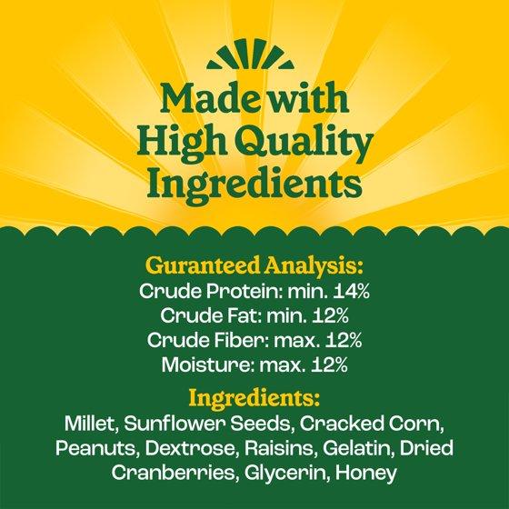 Millet, Sunflower Seeds, Cracked Corn, Peanuts, Dextrose, Raisins, Gelatin, Dried Cranberries, Glycerin, Honey