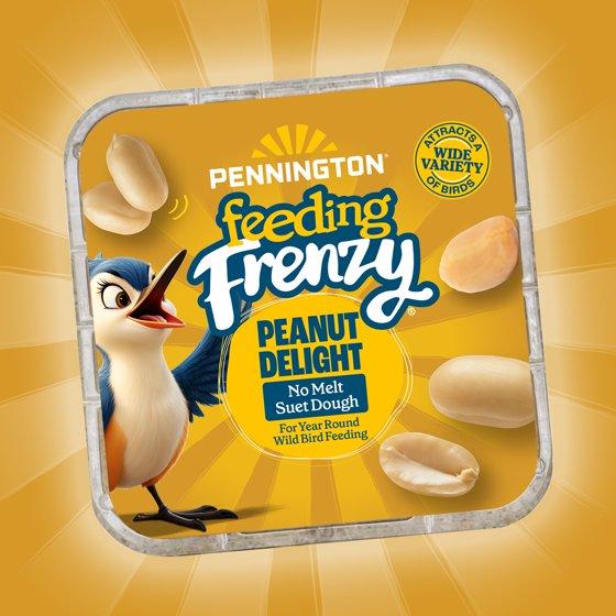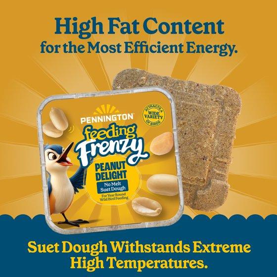 Feeding wild birds is a year-round joy—and with Pennington’s Feeding Frenzy Peanut Delight No Melt Suet Dough, it’s easier than ever, even on the hottest days. Specially formulated to withstand extreme high temperatures, this bird food for outside wild birds delivers dependable nutrition no matter the season. This bird feeder suet is made with high-quality peanut pieces, this soft yet hearty formula attracts a vibrant mix of birds like nuthatches, woodpeckers, jays, and wrens. It fuels birds throughout every season: from frigid winter mornings to scorching summer afternoons. In spring, suet helps birds stay energized for nesting and raising chicks. Fall calls for extra calories as birds migrate or prep for winter—this dough supports it all. This mess-free suet dough is leaving no waste behind and works beautifully as a treat for wild birds. Simply unwrap and place in any standard wire suet feeder for an easy, joyful bird-feeding experience, perfect for any bird feeder who enjoys watching their backyard come alive. Pair with Feeding Frenzy’s All Birds High Energy Blend in Pennington’s Copper Roof or EZ Feeder for a complete bird-feeding experience.