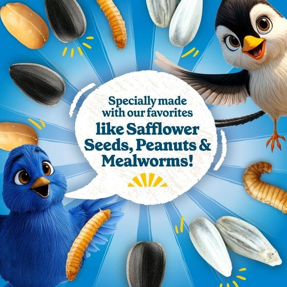 - This bird feeder food has safflower seeds, peanuts, mealworms & sunflower seeds