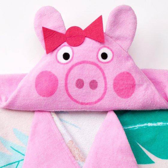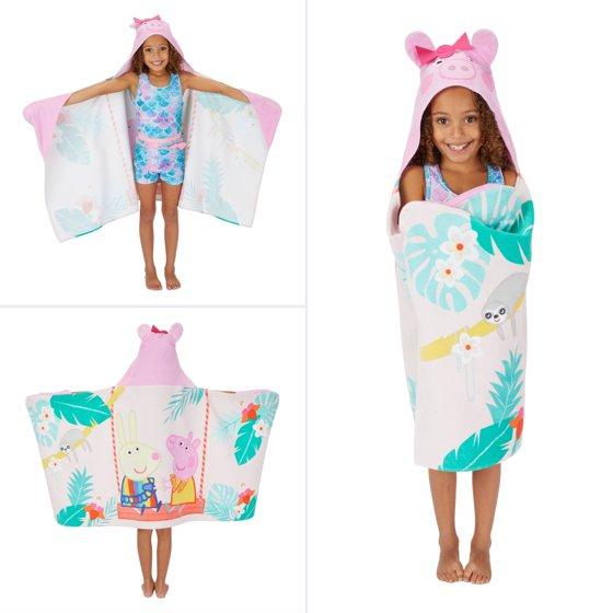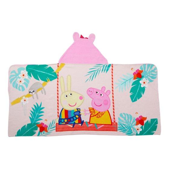Wrap your child in the playful charm of this Peppa Pig hooded towel! This Peppa Pig hooded towel showcases a tropical-themed illustration with Peppa and her friend Suzy, swinging amidst vibrant palm leaves and playful creatures. The vibrant pink hood, featuring Peppa Pig, is adorned with 3D plush ears and a charming felt red bow, designed to allow your child to transform into the beloved character for imaginative fun and cozy comfort. This soft and absorbent hooded towel is perfect for keeping your little one cozy and dry after swimming or bathing. The versatile design allows it to be worn as a poncho or bathrobe, with corner pockets to keep it in place. Made from 100% cotton and measuring 24 in x 50 in, it's easy to wash and dry. Whether they’re at the pool, beach, or bath, make splash time even more fun with this adorable Peppa Pig hooded towel.