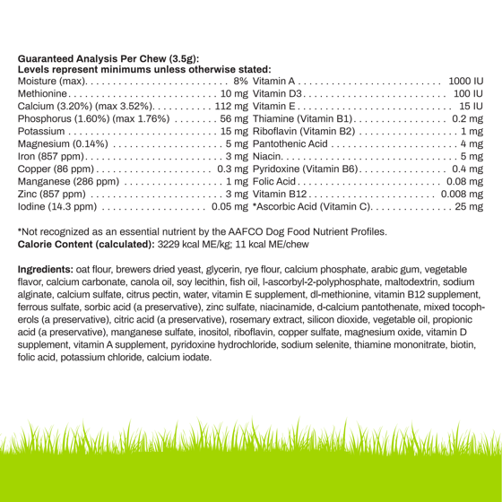 oat flour, brewers dried yeast, glycerin, rye flour, calcium phosphate, Arabic gum, vegetable flavor, calcium carbonate, canola oil, soy lecithin, fish oil, l-ascorbyl-2-polyphosphate, maltodextrin, sodium alginate, calcium sulfate, citrus pectin, water, vitamin E supplement, dl-methionine, vitamin B12 supplement, ferrous sulfate, sorbic acid (a preservative), zinc sulfate, niacinamide, d-calcium pantothenate, mixed tocopherols (a preservative), citric acid (a preservative), rosemary extract, silicon dioxide, vegetable oil, propionic acid (a preservative), manganese sulfate, inositol, riboflavin, copper sulfate, magnesium oxide, vitamin D supplement, vitamin A supplement, pyridoxine hydrochloride, sodium selenite, thiamine mononitrate, biotin, folic acid, potassium chloride, calcium iodate