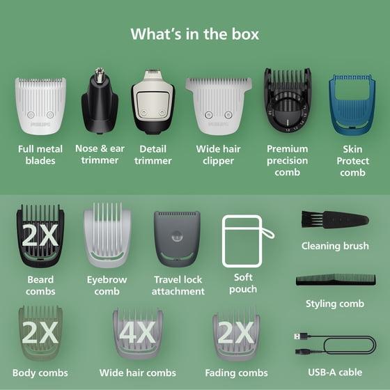 Try out a new look any day of the week with the durable Philips Norelco All-in-One 7000 series hair trimmer for men. With 22 attachments, self-sharpening steel blades for long-lasting precision, and a durable, lithium-ion battery with up to 3 hour runtime, this versatile and efficient electric razor for men efficiently tackles all your grooming needs. It's a hair and beard trimmer men can always rely on! Effortlessly trim and style your beard and hair with precision blades and beard combs that deliver clean, straight lines for your desired look. Use the hair-clipping comb with various length settings to maintain your hairstyle at home. With the click-on body comb ensuring a gentle, effective trim, the device also works perfectly as a body trimmer for men. Plus, you can easily remove unwanted nose and ear hair without nicks or cuts with the nose hair trimmer attachment. Achieve a precise and even trim with self-sharpening steel blades that deliver added strength for maximum precision, staying as sharp as day one with no blade oil required. Select from 0.5 to 16 mm length settings to craft your desired look to the exact length you want. The premium stainless steel trimmer is easy to hold and maneuver with an ergonomic rubber grip for superior comfort and control. Built to last, the durable lithium-ion battery offers up to 3 hours of runtime for uninterrupted trimming. The battery indicator keeps you fully informed of your battery status, whether it’s low, empty, fully charged, or still charging, ensuring you're always ready for your next grooming session. With USB-A charging, it's easy to power up anywhere (adapter is not included). The trimmer is 100% showerproof, so you can use it both wet and dry for a comfortable, convenient experience, every time. Plus, it’s easy to clean too.Try out a new look any day of the week with the durable Philips Norelco All-in-One 7000 series hair trimmer for men. With 22 attachments, self-sharpening steel blades for long-lasting precision, and a durable, lithium-ion battery with up to 3 hour runtime, this versatile and efficient electric razor for men efficiently tackles all your grooming needs. It's a hair and beard trimmer men can always rely on! Effortlessly trim and style your beard and hair with precision blades and beard combs that deliver clean, straight lines for your desired look. Use the hair-clipping comb with various length settings to maintain your hairstyle at home. With the click-on body comb ensuring a gentle, effective trim, the device also works perfectly as a body trimmer for men. Plus, you can easily remove unwanted nose and ear hair without nicks or cuts with the nose hair trimmer attachment. Achieve a precise and even trim with self-sharpening steel blades that deliver added strength for maximum precision, staying as sharp as day one with no blade oil required. Select from 0.5 to 16 mm length settings to craft your desired look to the exact length you want. The premium stainless steel trimmer is easy to hold and maneuver with an ergonomic rubber grip for superior comfort and control. Built to last, the durable lithium-ion battery offers up to 3 hours of runtime for uninterrupted trimming. The battery indicator keeps you fully informed of your battery status, whether it’s low, empty, fully charged, or still charging, ensuring you're always ready for your next grooming session. With USB-A charging, it's easy to power up anywhere (adapter is not included). The trimmer is 100% showerproof, so you can use it both wet and dry for a comfortable, convenient experience, every time. Plus, it’s easy to clean too. Comes with 1x Philips Norelco All-in-One Trimmer 7000 Series, 1x full metal blade, 1x detail trimmer, 1x nose trimmer, 1x wide hair clipper, 1x premium precision trimming comb (1-3 mm), 2x beard combs (5,7 mm), 4x wide hair combs (4 mm, 9 mm, 12 mm, 16 mm), 2x fading hair combs, 2x body combs (3,5 mm), 1x Skin Protect comb, 1x eyebrow comb, 1x storage pouch, 1x travel lock attachment, 1x cleaning brush, 1x USB-A charging cable; power adapter not included