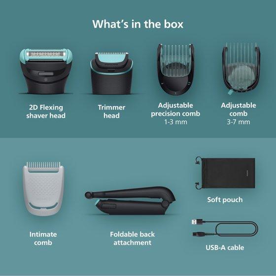 - The set includes: 1x Philips Norelco Body Groomer 7000 Series, 1x 2D flexing head with Triple Protect shave system, 1x skin-friendly trimmer head, 3x combs and more - see the description