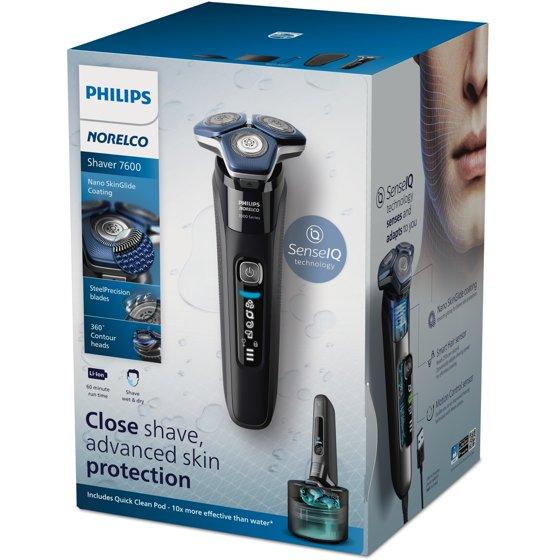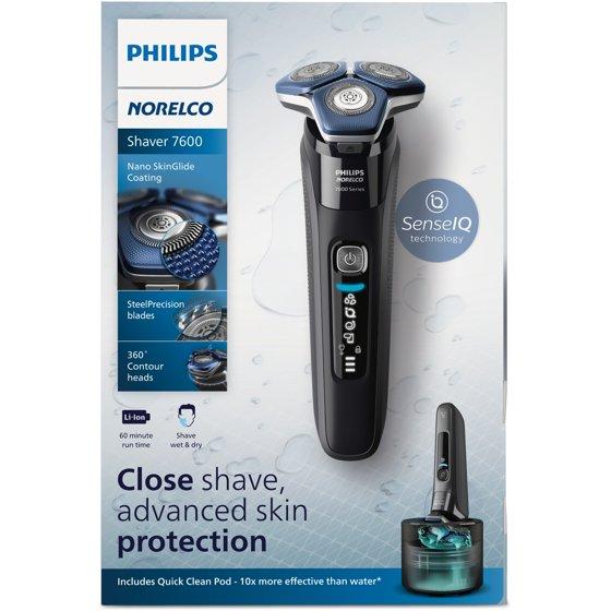The Philips Norelco Shaver 7600 glides smoothly over your skin, while cutting each hair close - even on 3-day beards. Equipped with Sense IQ technology, the shaver senses, adapts and guides on the correct motion, for better skin protection. Electric shaver, travel case, Quick Clean Pod, Philips Norelco Quick Clean Pod cartridge 160mL (5.41 FL Oz), cleaning brush and USB-A charging cable (wall power adapter not included)