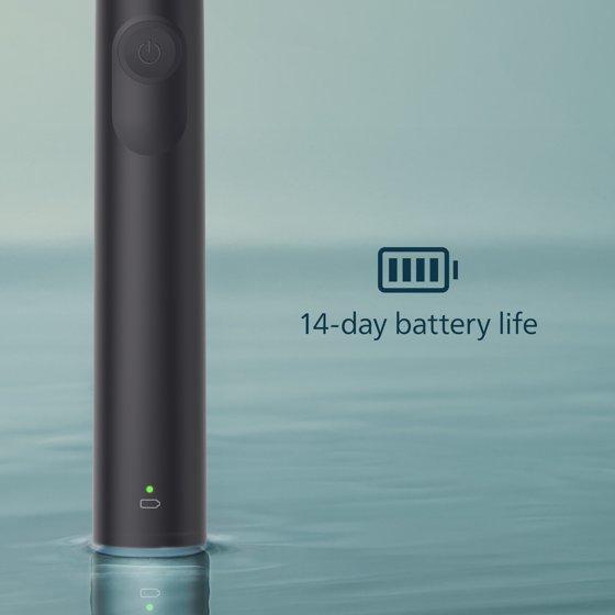 - Rechargeable toothbrush providing up to 14 days of regular brushing on a full charge