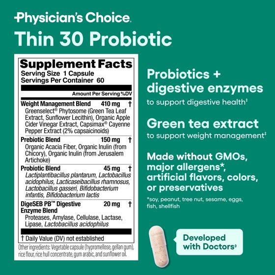 Physician's Choice Thin 30 Probiotic 60 Counts for Weight Management & Bloating - Supports Gut Health - Weight Management for Women & Men