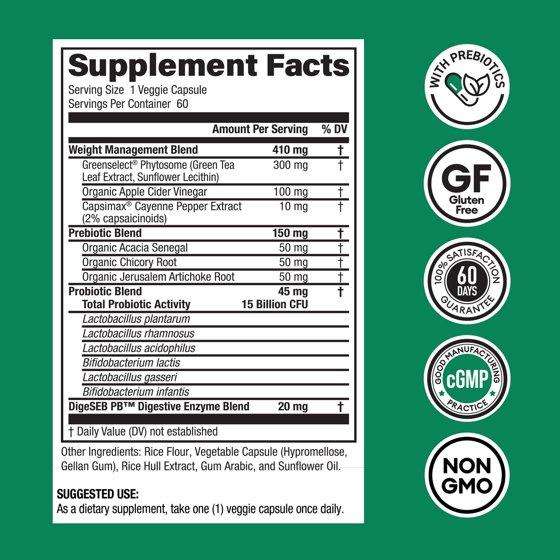 Greenselect Phytosome Green Tea Complex (Green Tea Leaf Extract, Sunflower Lecithin), Organic Apple Cider Vinegar, Organic Acacia Senegal, Organic Chicory Root, Organic Jerusalem Artichoke Root, DigeSEB PB Digestive Enzyme Blend, Capsimax Cayenne Pepper Extract (2% capsaicinoids), Lactobacillus plantarum, Lactobacillus rhamnosus, Lactobacillus acidophilus, Lactobacillus gasseri, Bifidobacterium infantis, Bifidobacterium lactis, Vegetable capsule (Hypromellose, Gellan Gum), Rice flour, Rice Hull Extract, Gum Arabic, and Sunflower Oil.