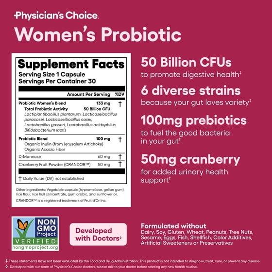 - Once Daily Probiotics for Women: A probiotic supplement for women with 50 Billion CFUs plus clinically proven ingredients to help promote digestion, immune support and feminine health. Organic prebiotics and 6 probiotic strains with D-Mannose & ProCran, a science backed cranberry extract that provides powerful antioxidants. 50 mg of ProCran is equivalent to 2,500 mg of cranberries without the sugar and calories.