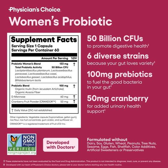 Physician’s Choice Women’s Probiotic with Prebiotic and Cranberry Fruit Powder, 50 Billion CFU, 60 ct.