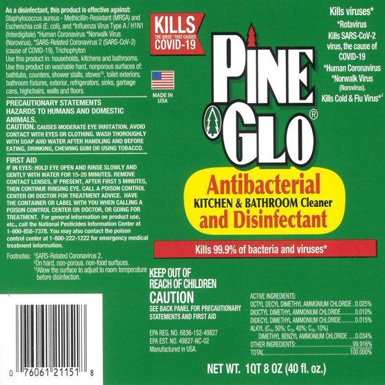 Pine Glo Products Inc. produces highly effective and nationally trusted products, being made consistently and priced right. Pine Glo is a Federal EPA registered disinfectant cleaner. This means that the product is proven to kill germs and viruses. Pine Glo production meets very rigorous quality & testing standards in every batch with a very low tolerance for ingredient variation. This means that the quality of Pine Glo's powerful cleaning capabilities will not change from production batch to production batch. Providing the nation with the best cleaning products available. Pine Glo produces products with natural and crisp scents that disinfect and revitalize at the same time. A natural pine scent freshens the air while keeping areas clean and safe. Pine scents are malleable to brighten any environment in need of disinfecting and cleaning. Use Pine Glo on sinks, toilets, tubs, showers, floors, sealed wood surfaces, appliances, counters, windows, mirrors, walls and door knobs.