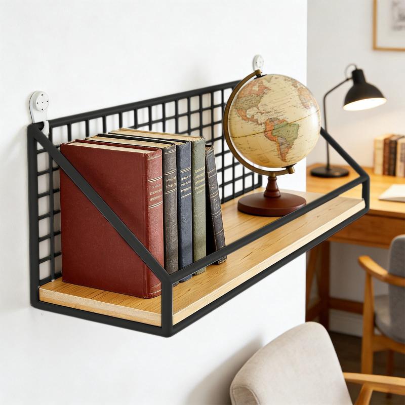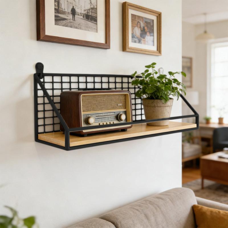 This is a wall mounted storage rack with iron mesh and wooden plywood. It adopts a industrial style , and the mesh guardrail can stop items from slipping while retaining a transparent visual effect. The wooden plywood adds a natural and warm texture.