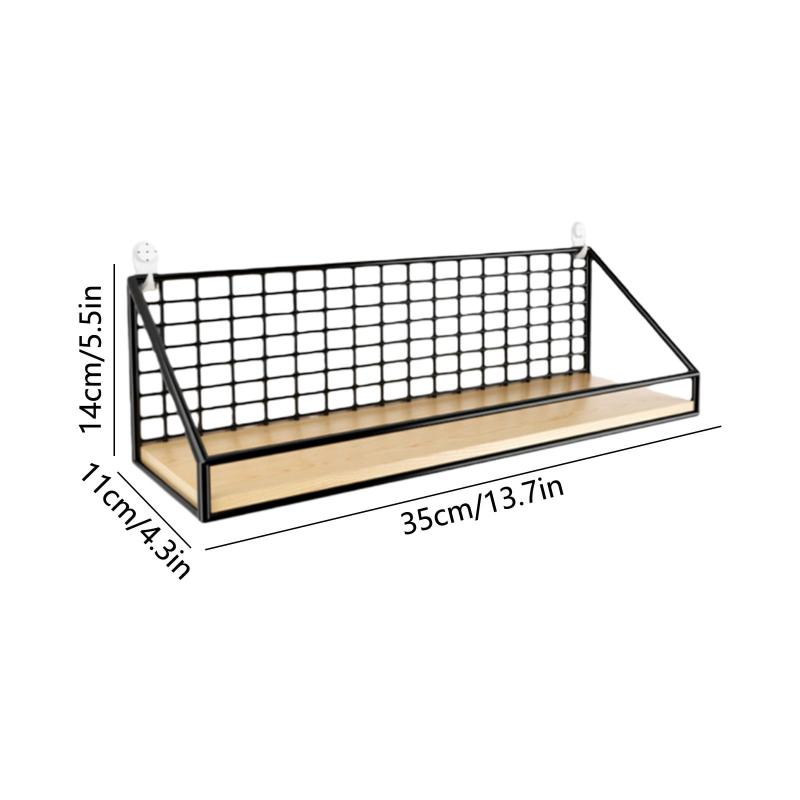 - This is a wall mounted storage rack with iron mesh and wooden plywood. It adopts a industrial style , and the mesh guardrail can stop items from slipping while retaining a transparent visual effect. The wooden plywood adds a natural and warm texture.