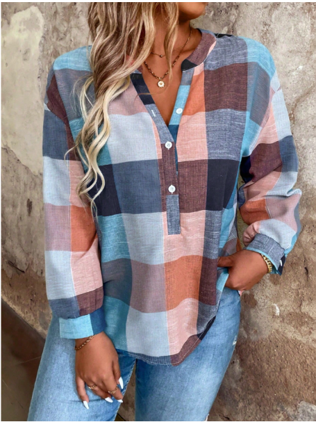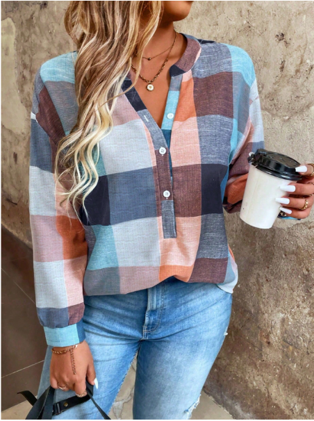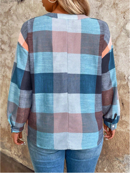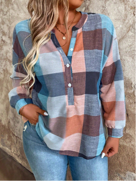 Plus Size Button Front Half Placket Checkered Blouse Fall Cloth For Women