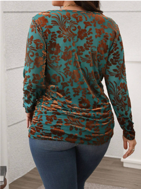 Plus Size Casual Flower Pattern Round Neck Long Sleeve T-Shirt, Autumn Thanksgiving Women New Years Raves