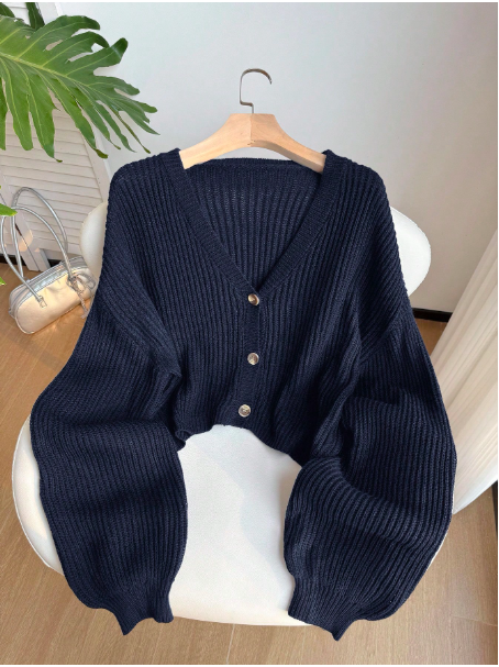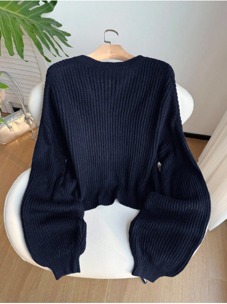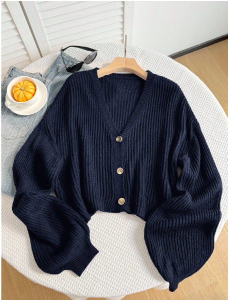 Plus Size Navy V-Neck Button Front Long Sleeve Pullover Sweater/Winter