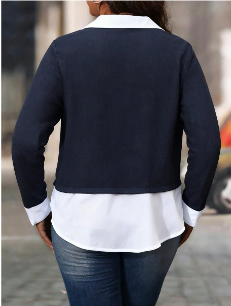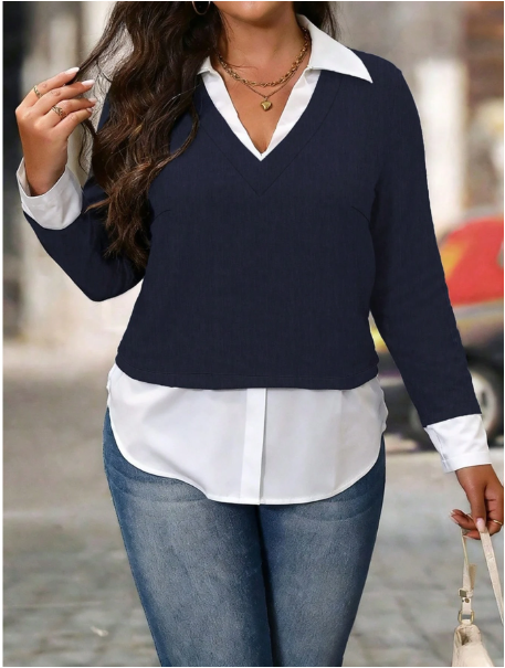 Plus Size Elegant Personalized Versatile Casual Retro Urban Commute Two-Piece Knit Contrast Color Shirt, Suitable For Graduation, Holidays, Valentine's Day, Music Festivals, Mother's Day, Halloween, Thanksgiving, Easter, National Day, Balls, Dates, Partie