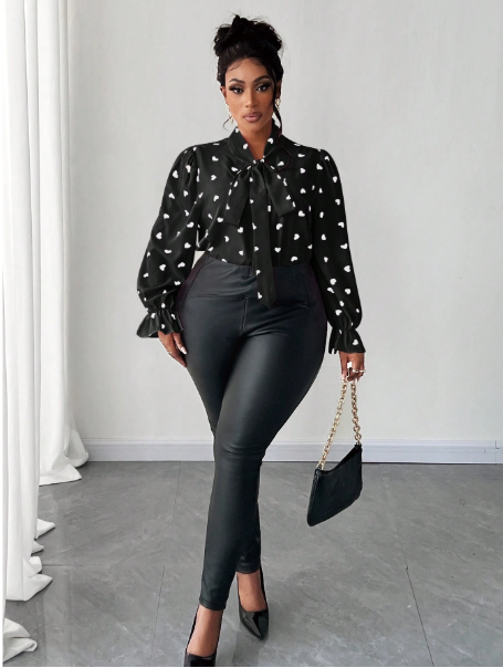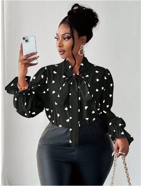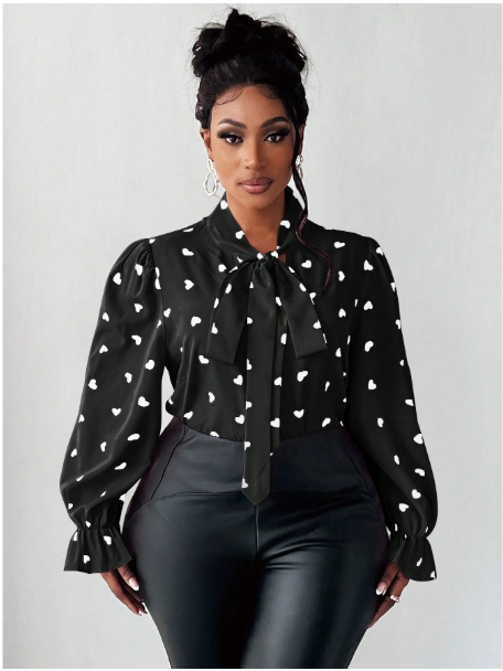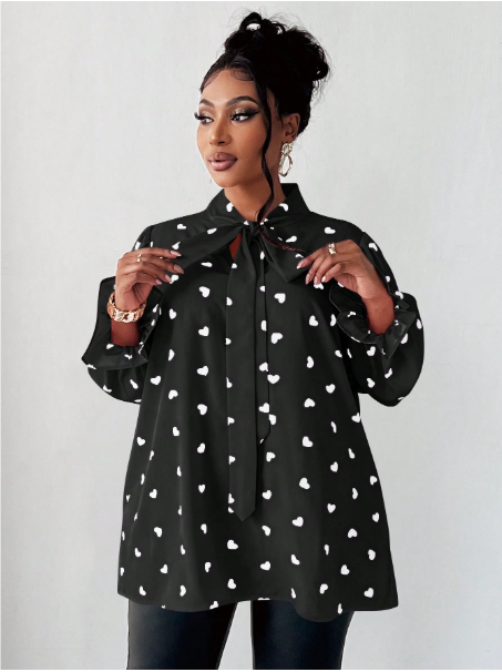 Plus Size Front Tie Long Sleeve Casual Shirt With All-Over Heart Print