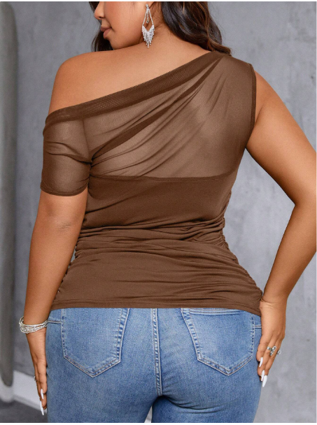 Plus Size Women's Oblique-Shoulder Mesh Spliced See-Through Top, Casual/Vacation