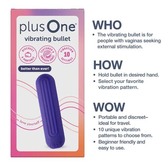 The plusOne Vibrating Bullet—your go-to classic just got even better. Created with silky, body-safe silicone and a soft-touch finish, this compact vibrator now features subtle grooves for added sensation and easy grip. With 10 refined vibration settings, you can explore everything from gentle tease to intense thrills. ​ ​ A rechargeable lithium-ion battery provides up to 1 hour of use, and the improved charging design ensures easy power-up—just insert the pin until the LED light pulses. Fully waterproof and discreet, it’s perfect for the bath, shower, or wherever pleasure takes you.