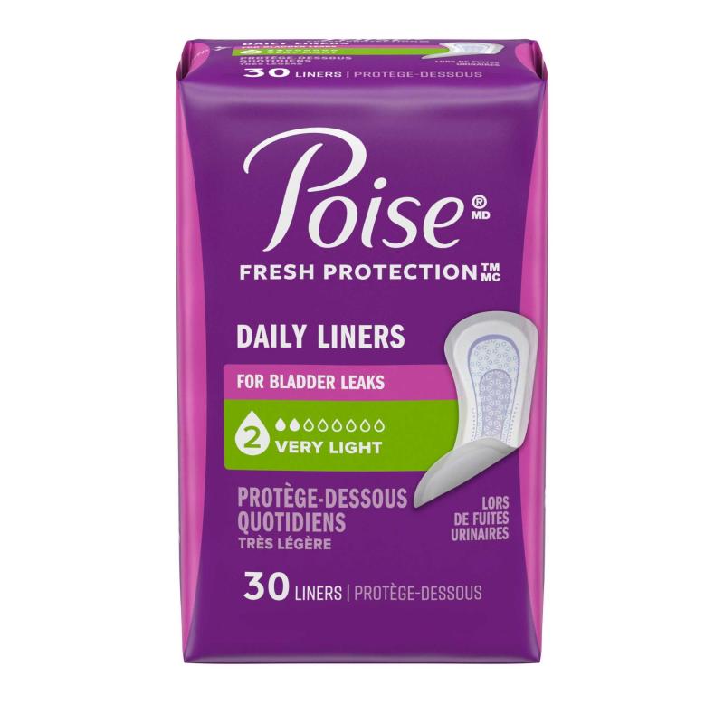- POISE DAILY LINERS: 30 incontinence and postpartum bladder leak panty liners, 2 Drop Very Light Absorbency, regular length (30 pantiliners total)