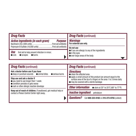 Help prevent infection in minor cuts, scrapes and burns with Polysporin First Aid Antibiotic Ointment. This topical skin ointment combines the power of the antibiotic ingredients bacitracin zinc (500 units/gm) with polymyxin B sulfate (10,000 units/gm) for first aid antibiotic power that is neomycin-free. Polysporin First Aid Antibiotic Ointment is the #1 dermatologist-recommended first aid ointment for infection protection. Simply apply a small amount of wound care ointment on the affected area one to three times a day, cover with a sterile bandage and enjoy infection protection. This ointment makes a great addition to a first aid kit or wound care supplies.