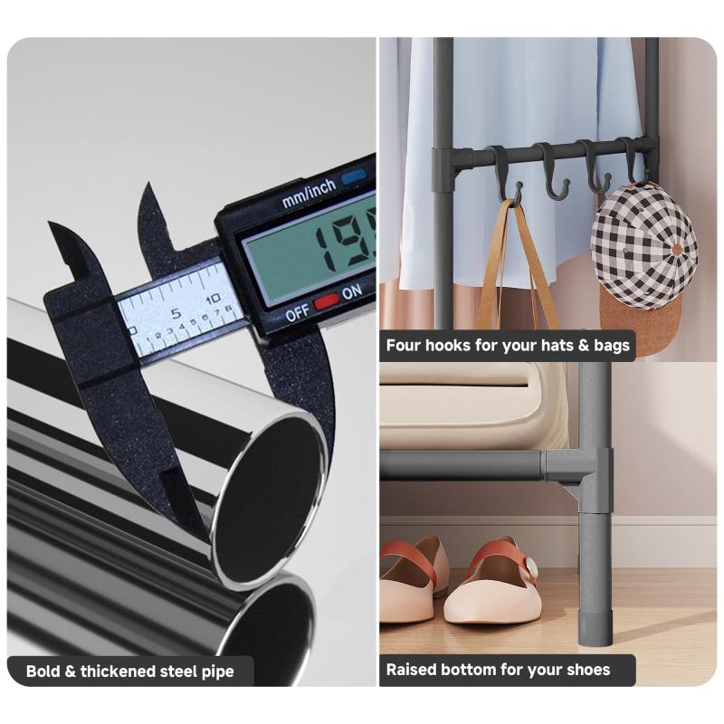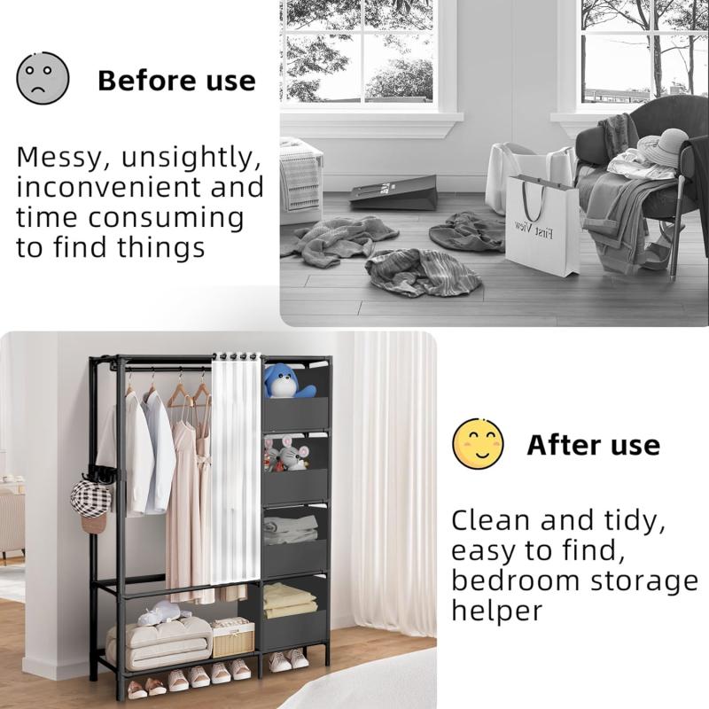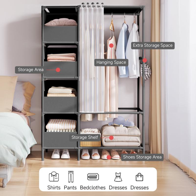 This clothes rack provides semi-open storage space for your clothes, with multiple storage areas and dust curtains, making it easier for you to select clothes and store items. -