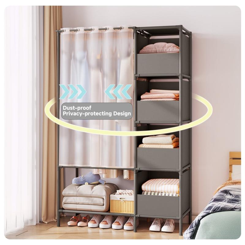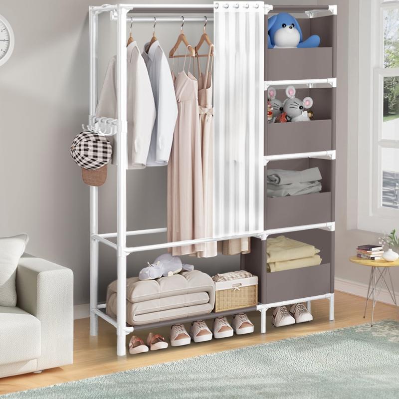 This clothes rack provides semi-open storage space for your clothes, with multiple storage areas and dust curtains, making it easier for you to select clothes and store items. -