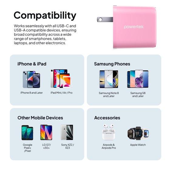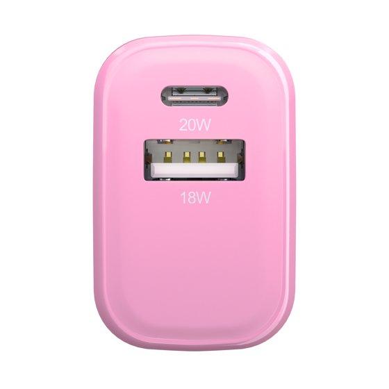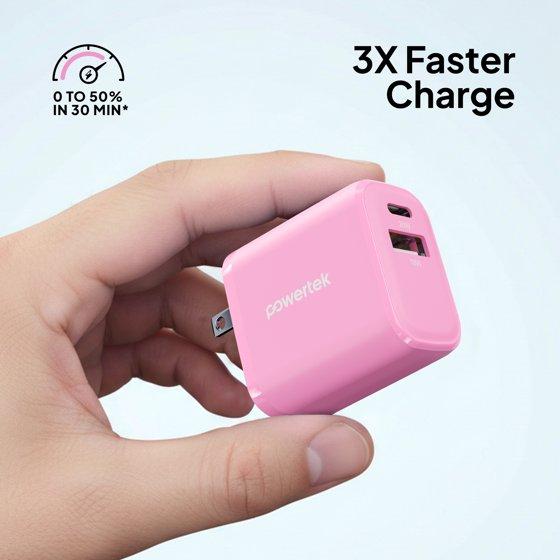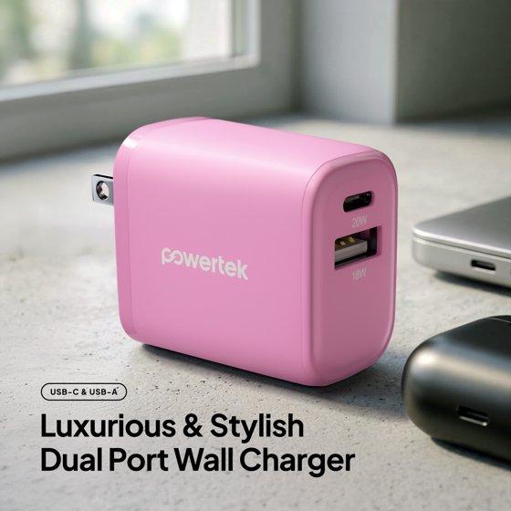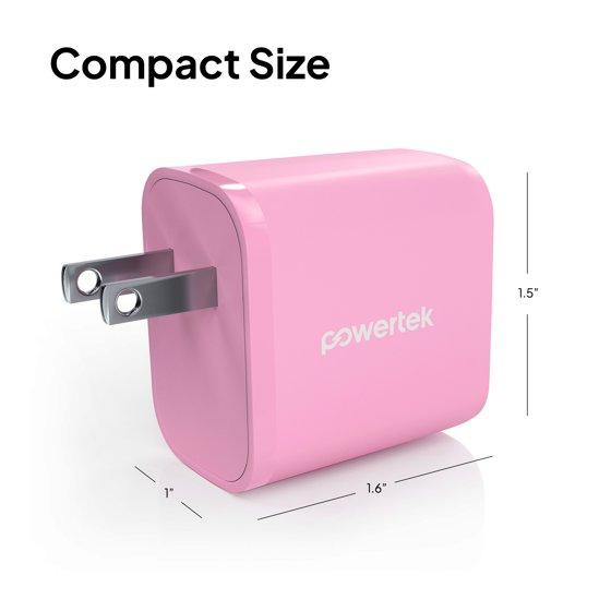 Powertek 20W USB-C + USB-A Wall Charger, Fast Charging Power Delivery Cube, Dual Port Compact Charger, Pink