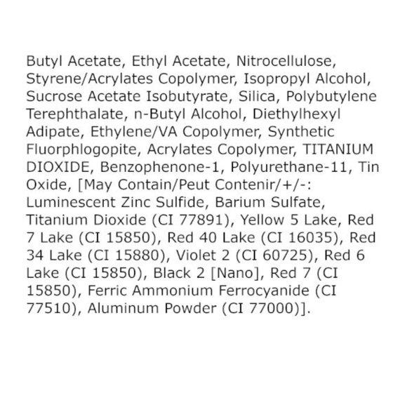 Butyl Acetate, Ethyl Acetate, Alcohol Denat., Nitrocellulose, Adipic Acid/Neopentyl Glycol/Trimellitic Anhydride Copolymer, Acetyl Tributyl Citrate, Isopropyl Alcohol, Silica, Sucrose Acetate Isobutyrate, Calcium Titanium Borosilicate, Stearalkonium Hectorite, Citric Acid, Tin Oxide, Isophorone Diamine/Isophthalic Acid/Tromethamine Copolymer, [May Contain/Peut Contenir/+/-: Titanium Dioxide (CI 77891), Red 28 (CI 45410), Ext. Violet 2 (CI 60730)].