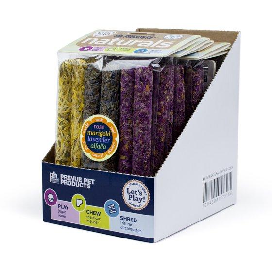 Naturals™ Flower Chew Sticks (#11076) from Prevue Pet Products are botanical chew sticks designed to support the core habits of small animal pets for playing, chewing, and shredding. Made from 100% pet-safe materials, including: Natural Ground Flowers: With no added dyes, these chew sticks contain ground alfalfa mixed with rose, marigold or lavender. Each package contains six sticks: 2 rose, 2 marigold and 2 lavender, all mixed with alfalfa. Chew sticks provide a fun and functional addition to your pet's habitat, and are mentally stimulating and promote healthy chewing. Can be added to the play accessories of a wide variety of small animal pets, including: guinea pig, rabbit, hamster, gerbil, rat, mouse, chinchilla, sugar glider. Dimensions: Each stick: approx.: 1/2" diameter x 5"L. (Full package of six sticks, with header card: 4"L x 3/4"W x 7-3/4"H. (Chew sticks are made from all natural materials and there will be variations in shape and size.)