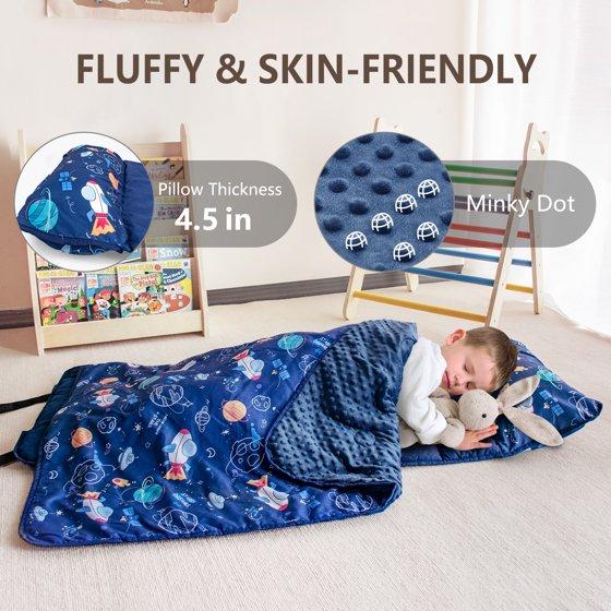 Primlect nap mat is made for easy naps and easier storage. You can roll it up in seconds, secure it with the built-in straps, and it fits neatly into daycare cubbies or classroom shelves. At 55" x 22", it gives your child plenty of room to rest, with a soft 43" x 35" blanket and removable 22" x 10" pillow. The plush minky dot lining feels gentle on skin, and the lightweight design with a carry handle makes it perfect for kidergarten, sleepovers, or travel. Whether it’s for daycare, a sleepover, or a weekend at grandma’s, this sleeping bag keeps naps simple, clean, and comfortable. And yes—it’s machine washable too.