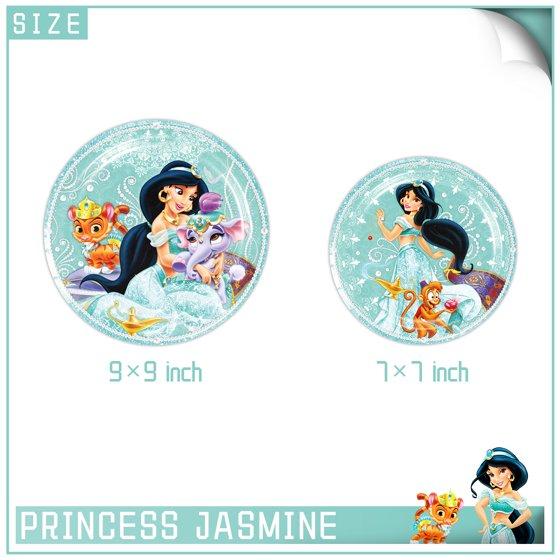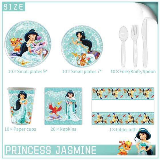 - This Jasmine party supplies set includes everything you need to entertain 10 guests, including Jasmine birthday decorations and themed birthday party tableware, including Jasmine party plates, a tablecloth, paper napkins, and paper cups.