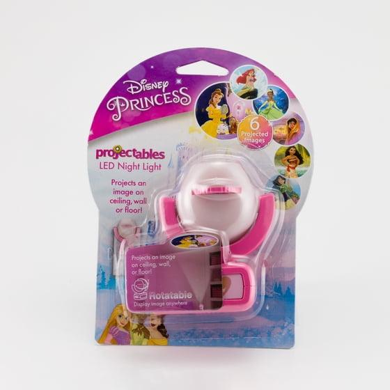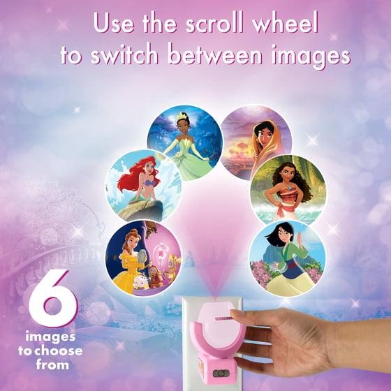 - Kids Night Light - Provides soft pink glow while projecting one of six Disney Princess images featuring Cinderella, Ariel, Aurora, Rapunzel, and Belle on ceiling, wall, or floor