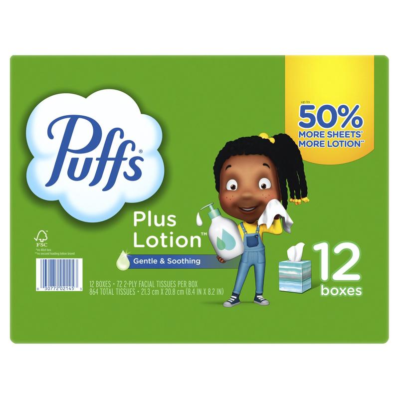 Puffs Plus Lotion 2-Ply Facial Tissues 12 Cube Boxes, 72 tissues/box