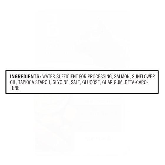 Water sufficient for processing, salmon, sunflower oil, tapioca starch, glycine, salt, glucose, guar gum, beta-carotene