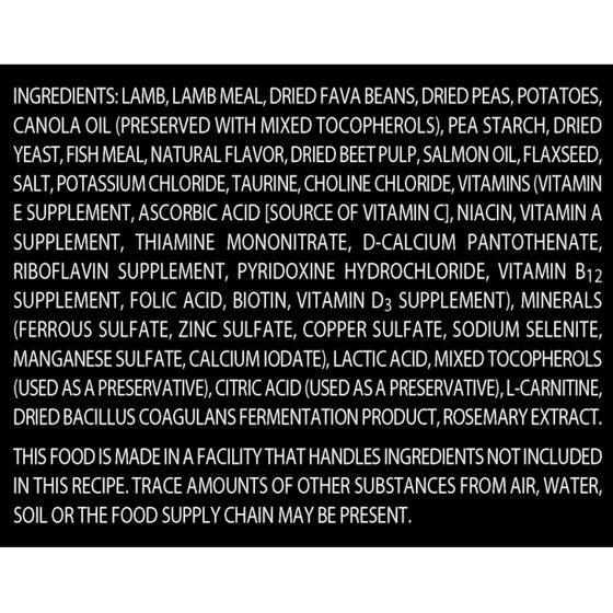 LAMB, LAMB MEAL, DRIED FAVA BEANS, DRIED PEAS, POTATOES, CANOLA OIL (PRESERVED WITH MIXED TOCOPHEROLS), PEA STARCH, DRIED YEAST, FISH MEAL, NATURAL FLAVOR, DRIED BEET PULP, SALMON OIL, FLAXSEED, SALT, POTASSIUM CHLORIDE, TAURINE, CHOLINE CHLORIDE, VITAMINS (VITAMIN E SUPPLEMENT, ASCORBIC ACID [SOURCE OF VITAMIN C], NIACIN, VITAMIN A SUPPLEMENT, THIAMINE MONONITRATE, D-CALCIUM PANTOTHENATE, RIBOFLAVIN SUPPLEMENT, PYRIDOXINE HYDROCHLORIDE, VITAMIN B₁₂ SUPPLEMENT, FOLIC ACID, BIOTIN, VITAMIN D₃ SUPPLEMENT), MINERALS (FERROUS SULFATE, ZINC SULFATE, COPPER SULFATE, SODIUM SELENITE, MANGANESE SULFATE, CALCIUM IODATE), LACTIC ACID, MIXED TOCOPHEROLS (USED AS A PRESERVATIVE), CITRIC ACID (USED AS A PRESERVATIVE), L-CARNITINE, DRIED BACILLUS COAGULANS FERMENTATION PRODUCT, ROSEMARY EXTRACT. THIS FOOD IS MADE IN A FACILITY THAT HANDLES INGREDIENTS NOT INCLUDED IN THIS RECIPE. TRACE AMOUNTS OF OTHER SUBSTANCES FROM AIR, WATER, SOIL OR THE FOOD SUPPLY CHAIN MAY BE PRESENT.