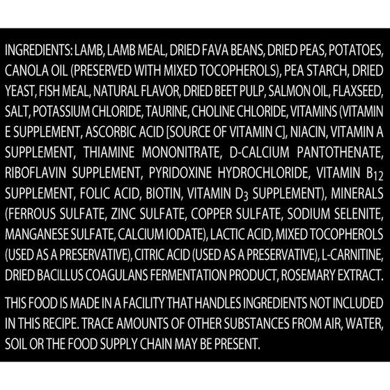 LAMB, LAMB MEAL, DRIED FAVA BEANS, DRIED PEAS, POTATOES, CANOLA OIL (PRESERVED WITH MIXED TOCOPHEROLS), PEA STARCH, DRIED YEAST, FISH MEAL, NATURAL FLAVOR, DRIED BEET PULP, SALMON OIL, FLAXSEED, SALT, POTASSIUM CHLORIDE, TAURINE, CHOLINE CHLORIDE, VITAMINS (VITAMIN E SUPPLEMENT, ASCORBIC ACID [SOURCE OF VITAMIN C], NIACIN, VITAMIN A SUPPLEMENT, THIAMINE MONONITRATE, D-CALCIUM PANTOTHENATE, RIBOFLAVIN SUPPLEMENT, PYRIDOXINE HYDROCHLORIDE, VITAMIN B₁₂ SUPPLEMENT, FOLIC ACID, BIOTIN, VITAMIN D₃ SUPPLEMENT), MINERALS (FERROUS SULFATE, ZINC SULFATE, COPPER SULFATE, SODIUM SELENITE, MANGANESE SULFATE, CALCIUM IODATE), LACTIC ACID, MIXED TOCOPHEROLS (USED AS A PRESERVATIVE), CITRIC ACID (USED AS A PRESERVATIVE), L-CARNITINE, DRIED BACILLUS COAGULANS FERMENTATION PRODUCT, ROSEMARY EXTRACT. THIS FOOD IS MADE IN A FACILITY THAT HANDLES INGREDIENTS NOT INCLUDED IN THIS RECIPE. TRACE AMOUNTS OF OTHER SUBSTANCES FROM AIR, WATER, SOIL OR THE FOOD SUPPLY CHAIN MAY BE PRESENT.