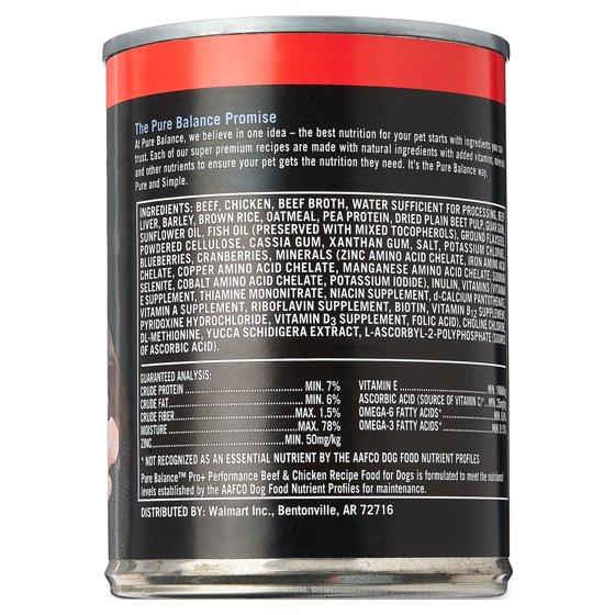 Pure Balance believes in one pure and simple thought: the best nutrition for your dog starts with the best ingredients. That's why our Pure Balance Pro+ Performance Beef & Chicken Recipe Wet Food for Dogs is made with carefully selected ingredients, to ensure your dog gets all the nutrition they need without any of the extra stuff they don't. Our Pro+ Performance Beef & Chicken Recipe wet food for dogs is vet formulated with healthy grains and real beef and chicken for healthy skin and coat and immune support. With no artificial preservatives, flavors, or colors, it's an ideal part of an active dog's diet. For the best ingredients, pure and simple, pick up a pack of our veterinarian formulated Pure Balance Pro+ Performance Beef & Chicken Recipe Wet Food for Dogs for your dog today.At Pure Balance, we believe in one idea – the best nutrition for your pet starts with ingredients you can trust. Each of our super premium recipes is made with natural ingredients with added vitamins, minerals and other nutrients to ensure your pet gets the nutrition they need. It's the Pure Balance way. Pure and Simple.If for any reason you or your pet don't love this product, we'll replace it or give you your money back. For questions, call 1-877-307-2192 or visit walmart.com.